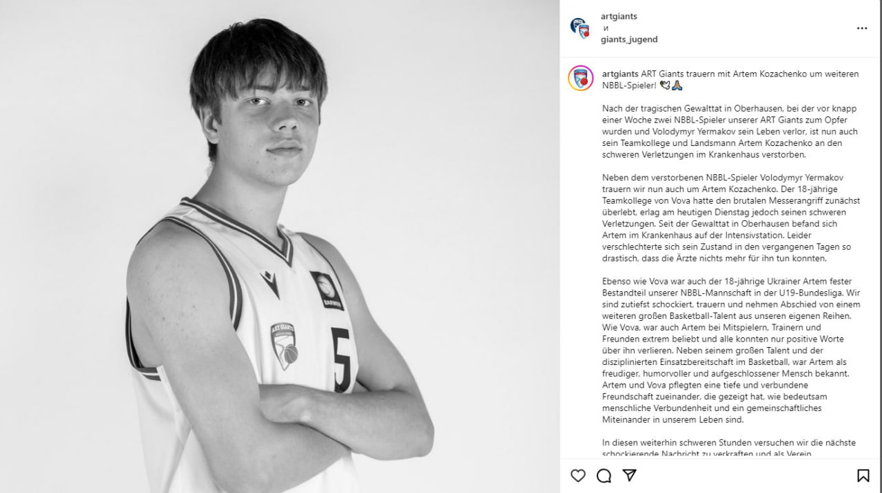 Напомним, на днях стало известно, что в Дюссельдорфе убили 17-летнего украинского баскетболиста Владимира Ермакова. Тогда был ранен и Козаченко, которого увезли в реанимацию.