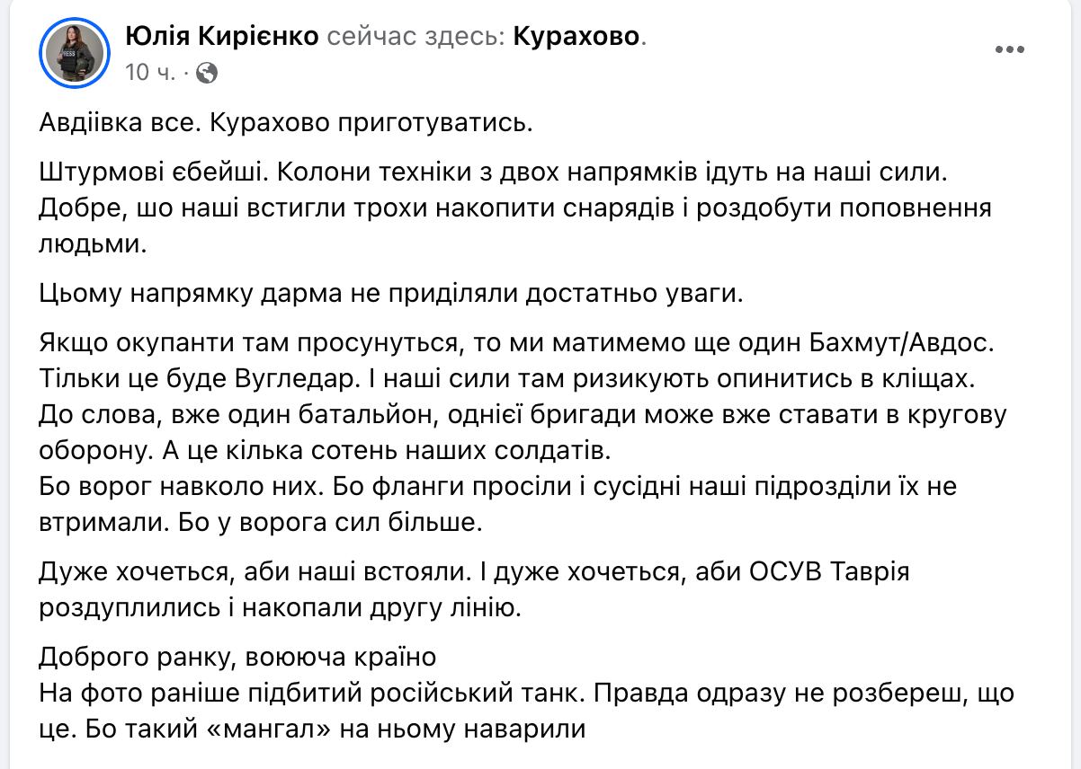 "Штурмовые е*ейшие. Колонны техники с двух направлений идут на наши силы. Хорошо, что наши успели немного накопить снарядов и раздобыть пополнение людьми. Этому направлению зря не уделяли достаточно внимания. Если оккупанты там продвинутся, то мы будем иметь еще один Бахмут/Авдос. Только это будет Угледар", - пишет Кириенко.