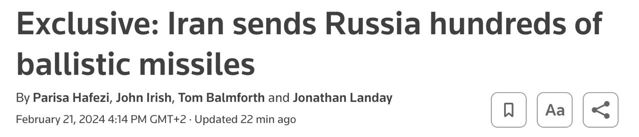 16:54 Иран передал России около 400 баллистических ракет класса "земля-земля", сообщает Reuters со ссылкой на источники.