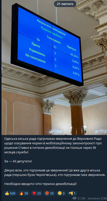 Одесский горсовет призывает Верховную Раду отменить норму о демобилизации через 36 месяцев по решению Ставки в законопроекте об ужесточении мобилизации. За такое обращение к парламенту проголосовали 43 местных депутата.