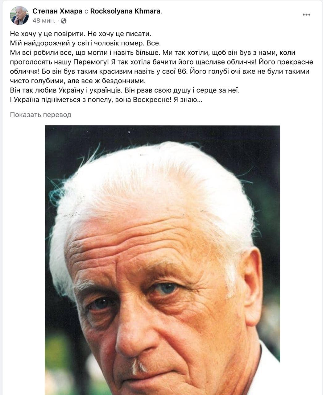 "Не хочу в это поверить. Не хочу писать это. Мой самый дорогой мужчина умер. Все. Мы все делали все, что могли, и даже больше. Мы так хотели, чтобы он был с нами, когда провозгласят нашу Победу! Я так хотела видеть его счастливое лицо! Его прекрасное лицо! Ибо он был так красив даже в свои 86. Его голубые глаза уже не были такими чисто голубыми, но все же бездонными. Он так любил Украину и украинцев. Он рвал свою душу и сердце за нее. И Украина поднимется из пепла, она воскреснет! Я знаю", – написала Роксолана Хмара.