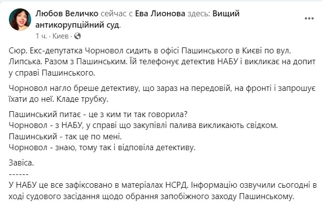 "Экс-депутат Татьяна Черновол сидит в офисе Пашинского в Киеве по ул. Липской. Вместе с Пашинским. Ей звонит по телефону детектив НАБУ и вызывает на допрос по делу Пашинского. Черновол нагло врет детективу, что она сейчас на передовой, на фронте, и приглашает ехать к ней. Кладет трубку. Пашинский спрашивает: "Это с кем ты так говорила?"