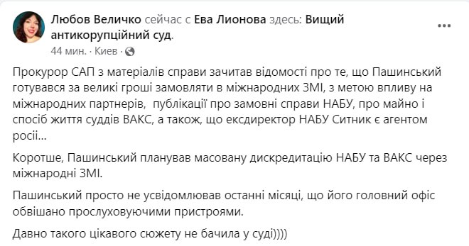 "Прокурор САП по материалам дела зачитал сведения о том, что Пашинский готовился за большие деньги заказывать у международных СМИ, с целью влияния на международных партнеров, публикации о заказных делах НАБУ, об имуществе и образе жизни судей ВАКС, а также, что экс-директор НАБУ Сытник является агентом России… Короче, Пашинский планировал массированную дискредитацию НАБУ и ВАКС через международные СМИ", – написала журналистка.