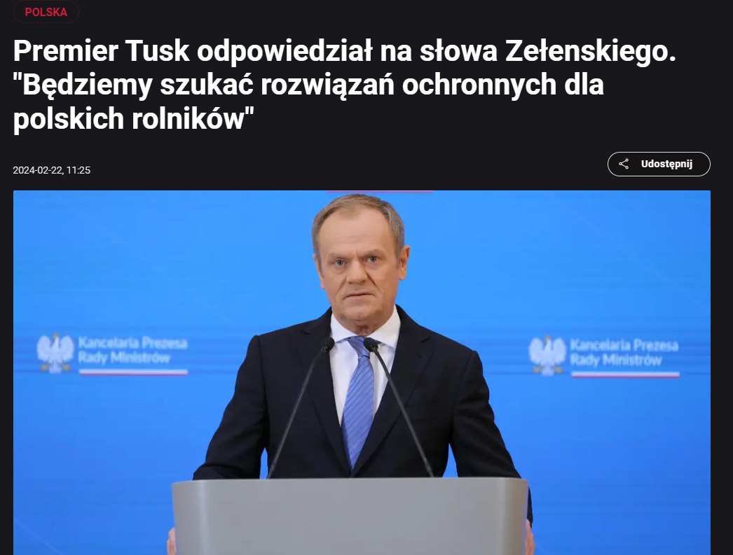 Премьер-министр сообщил, что Польша полностью обеспечивает транспортировку оружия и выразил важность защиты интересов польских фермеров и сельхозпроизводителей. Он также подчеркнул, что Польша всегда стояла на стороне Украины, поддерживая ее со дня начала войны и даже ранее, используя все доступные средства.