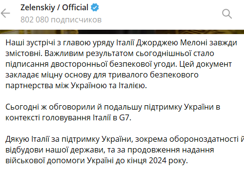 "Важным результатом сегодняшней встречи стало подписание двустороннего соглашения о безопасности. Этот документ закладывает прочную основу для длительного партнерства безопасности между Украиной и Италией", - написал Зеленский.