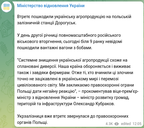 Вице-премьер Украины Александр Кубраков заявил, что эти инциденты похожи на "диверсию" и призвал правоохранителей Польши заняться их расследованием.
