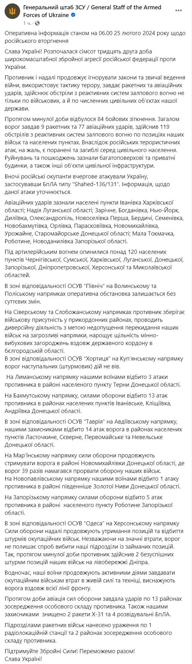 За прошедшие сутки произошло 84 боевых столкновения. Всего враг нанес 9 ракетных и 77 авиационных ударов, совершил 119 обстрелов из РСЗО по позициям наших войск и населенным пунктам.
