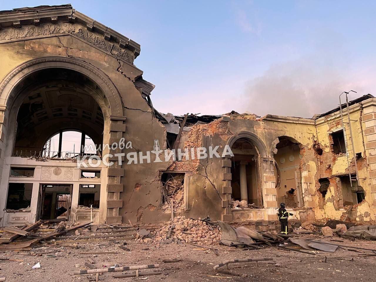 Сегодня утром в Константиновке Донецкой области россияне ударили по зданию железнодорожного вокзала. Повреждены также стоящий рядом ТРЦ, дома и православный храм.