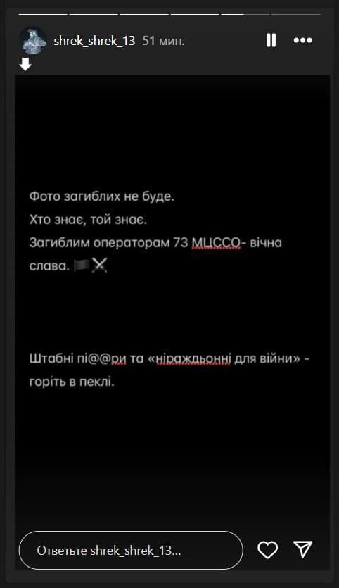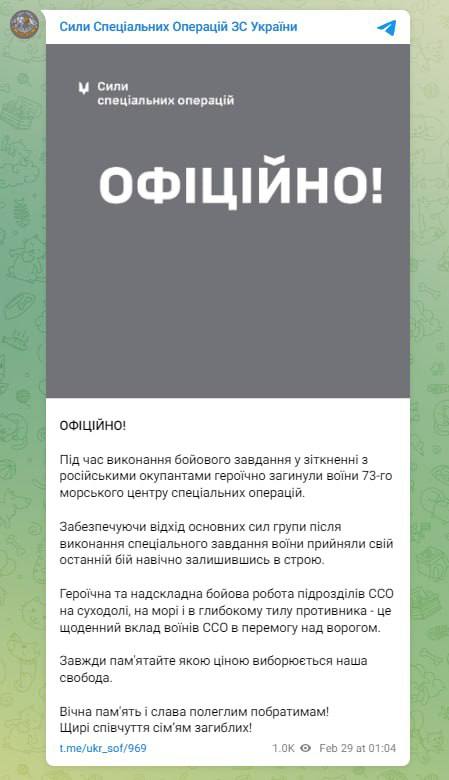 Силы специальных операций (ССО) ВСУ подтвердили гибель спецназовцев из 73-го морского центра специальных операций.