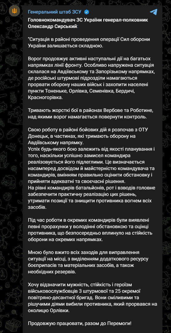 Главком Александр Сырский, который приехал на Авдеевское направление, сообщил, что подразделения 3-й штурмовой и 25-й отдельной воздушно-десантной бригад "выбили противника, прорвавшегося на окраину Орловки".