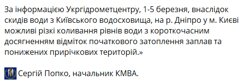 В КГВА добавили, что, по данным Укргидрометцентра, 1-5 марта в результате сбросов воды из Киевского водохранилища в реку Днепр в Киеве возможны резкие колебания уровней воды с кратковременным достижением отметок начального затопления пойм и пониженных приречных территорий.