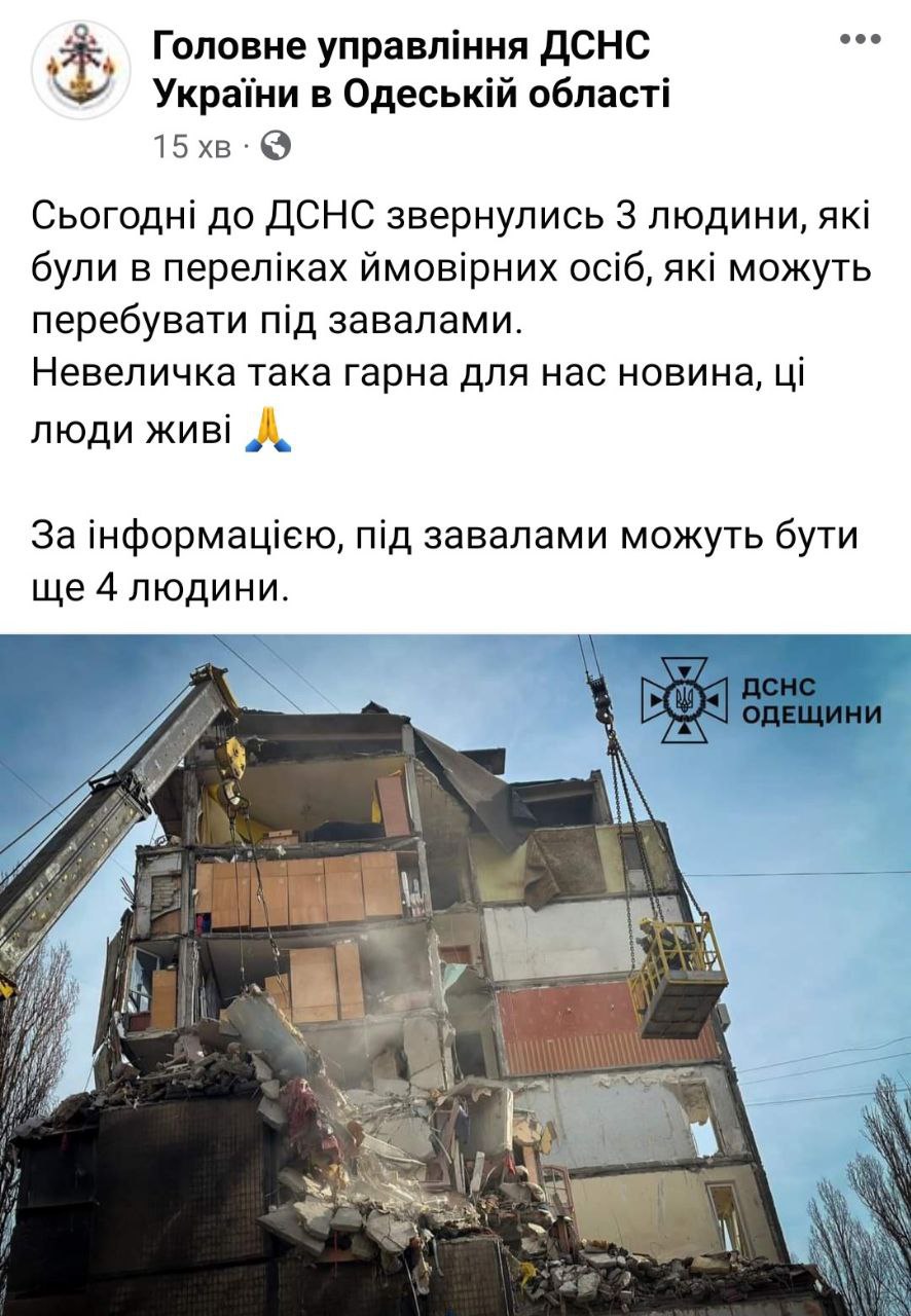 11:01 Под завалами дома в Одессе могут быть еще четыре человека, сообщает ГСЧС.