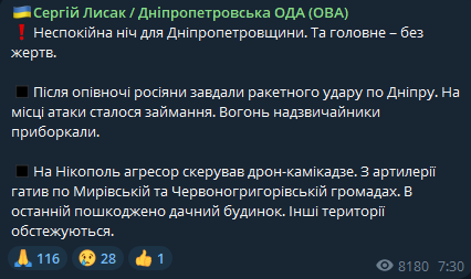 Также российские войска ночью атаковал Никополь, для атаки использовали дрон-камикадзе. С артиллерии ударили по Мировской и Красногригорьевской громаде. В последней поврежден дачный дом.