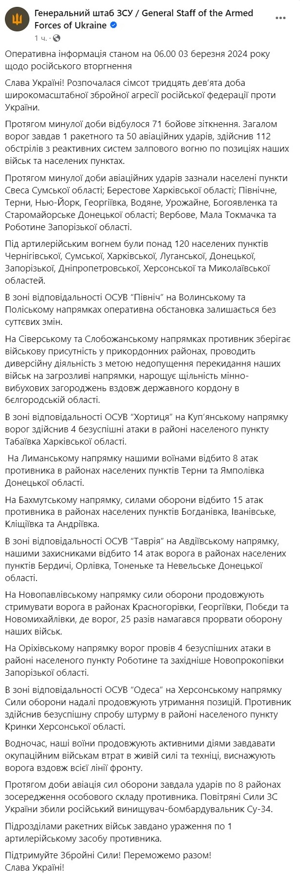 За прошедшие сутки произошло 71 боевое столкновение. Всего враг нанес 1 ракетный и 50 авиационных ударов, совершил 112 обстрелов из РСЗО по позициям наших войск и населенным пунктам.