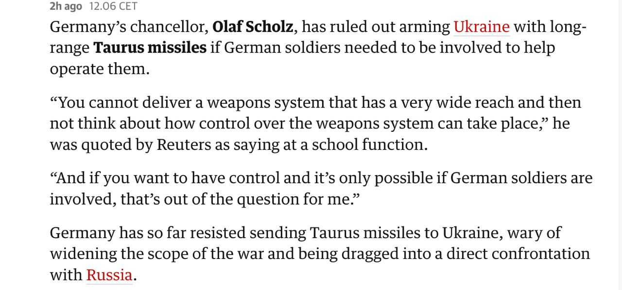 14.44 Шольц снова высказался против поставок Украине ракет Taurus, если их применение требует участия немецких военных, передает The Guardian.