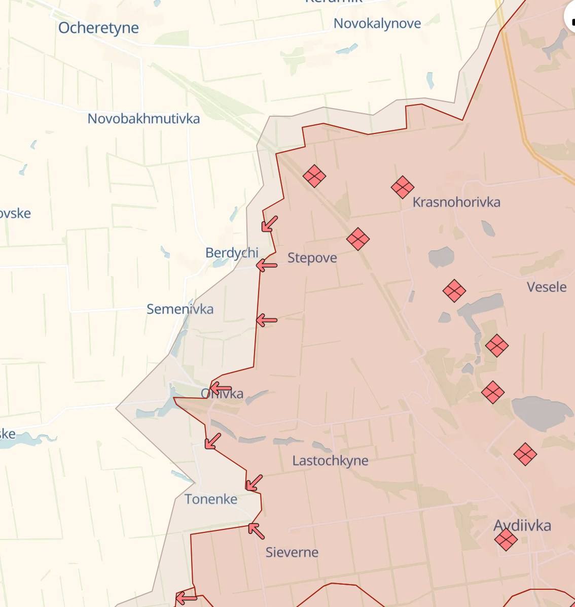 Ранее аналитик Bild Юлиан Рёпке сообщил, что армия РФ, по его данным, частично контролирует Бердычи, южную часть Орловки и часть Тоненького. И по линии этих трех сел ВСУ пытаются выстроить и удержать новую линию обороны.