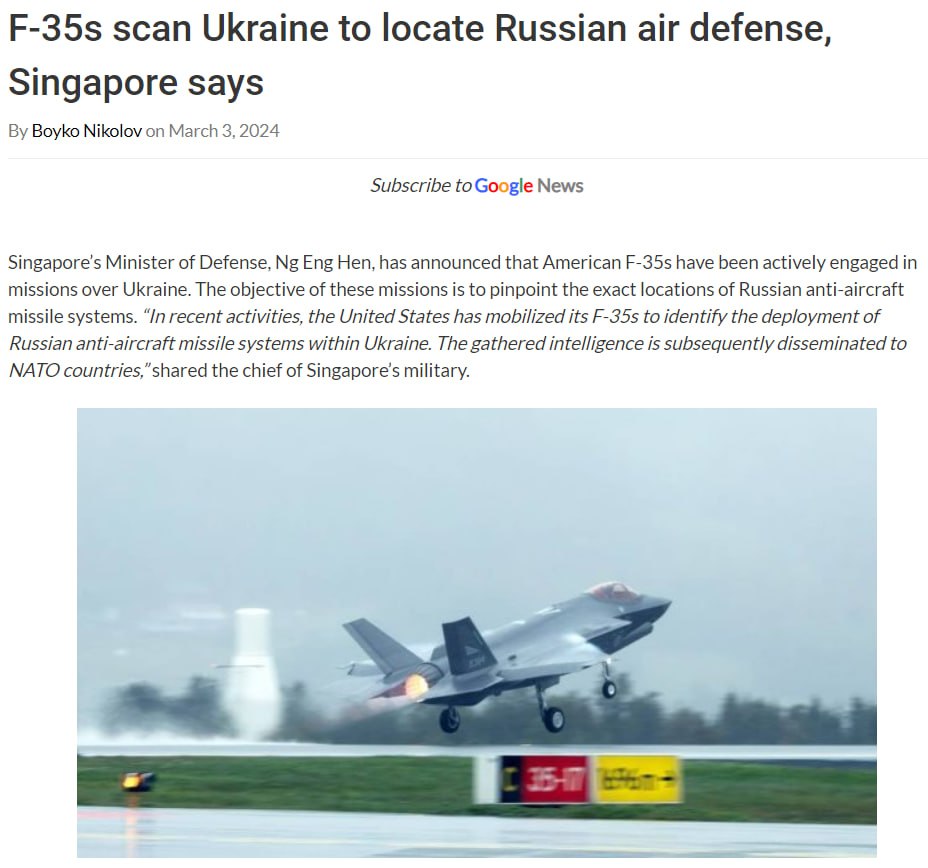 "Во время недавних действий США мобилизовали свои F-35 для выявления размещения российских зенитно-ракетных систем на территории Украины. Собранные разведданные впоследствии распространяются в странах НАТО", — заявил Нг Энг Хен.