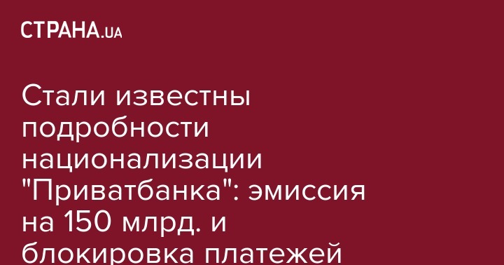 По данным "Украинских новостей", государство на 100% становится собственником банка. Кабмин выпустит 30-летние облигации внутреннего госзайма на 150 млрд гривен. Сроки выпуска и объемы пакетов пока неизвестны. Бумаги будет выкупать Национальный банк (фактически произведя для этого эмиссию), а полученная гривна будет "вливаться" в капитал Приватбанка.