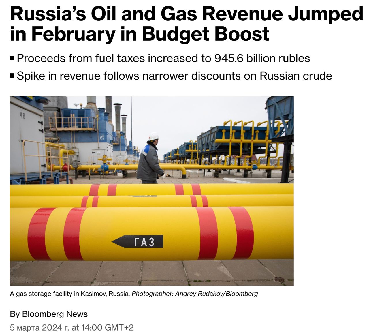 Доходы бюджета РФ от налогов на нефть и газ в феврале подскочили более чем на 80% по сравнению с 2023 годом и превысили 10 миллиардов долларов.