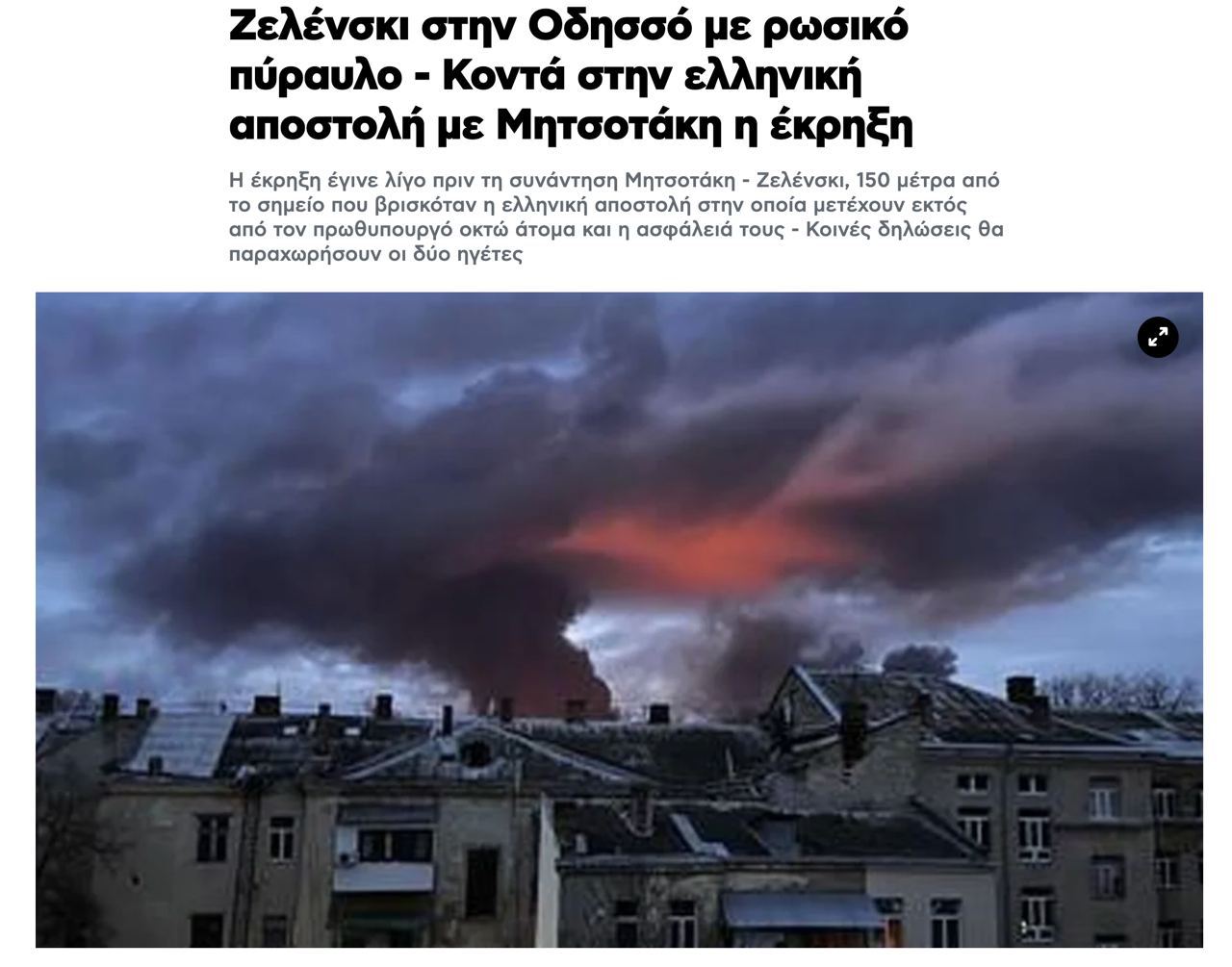 В публикации сказано, что встреча Владимира Зеленского и Кириакоса Мицотакиса прошла в обычном режиме, а лидеры двух стран проведут пресс-конференцию, которая не будет транслироваться в прямом эфире по соображениям безопасности.
