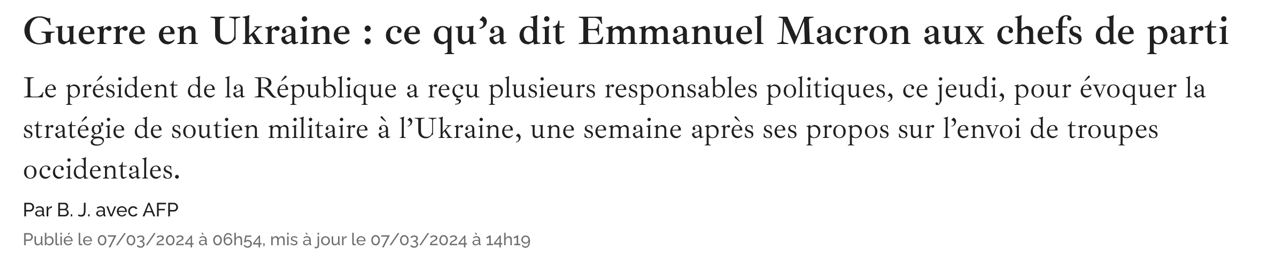 Напомним, в конце февраля Макрон не исключил отправку войск западных стран в Украину. Глава Пятой республики заявил, что этот вопрос обсуждался на совещании западных стран в Париже, но консенсус не был достигнут.