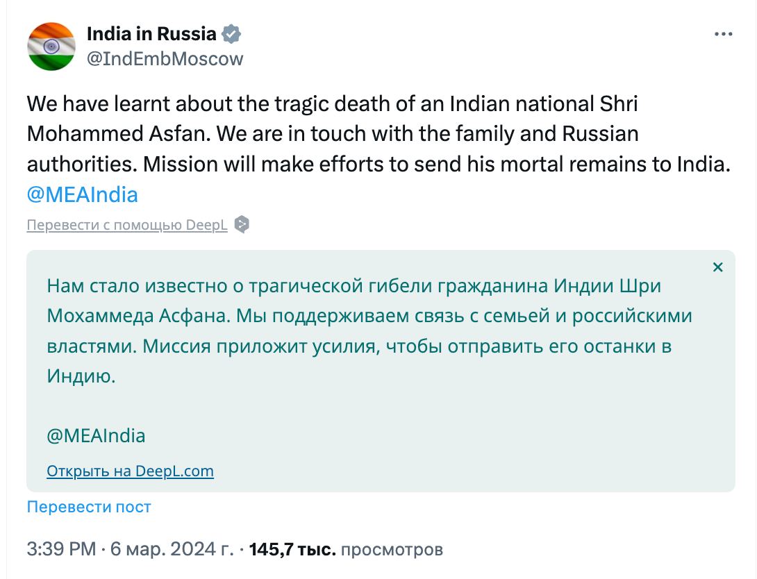 "Нам стало известно о трагической гибели гражданина Индии Шри Мохаммеда Асфана. Мы поддерживаем связь с семьей и российскими властями. Миссия приложит усилия, чтобы отправить его останки в Индию", - сказано в публикации.