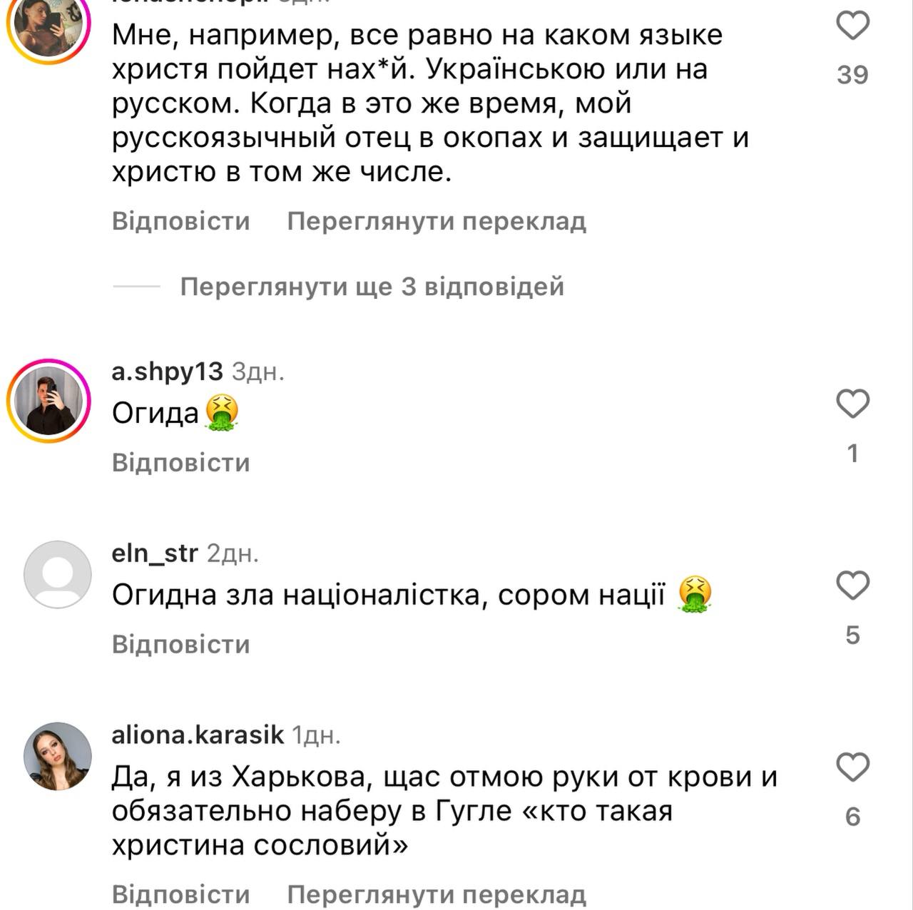 "Мне, например, все равно на каком языке Христя пойдет нах@й. Українською или на русском. Когда в это же время мой русскоязычный отец в окопах и защищает и Христю в том же числе".
