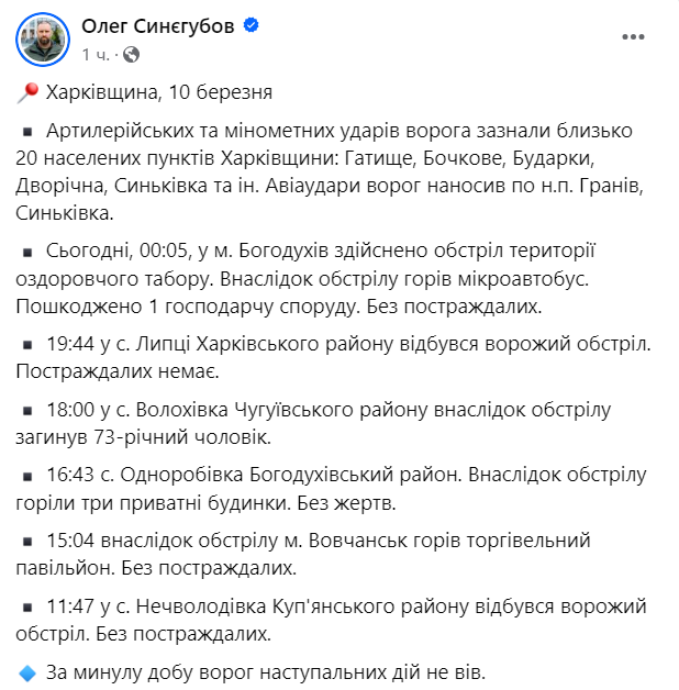 Также вчера в 18:00 в селе Волоховка Чугуевского района в результате обстрела погиб 73-летний мужчина.