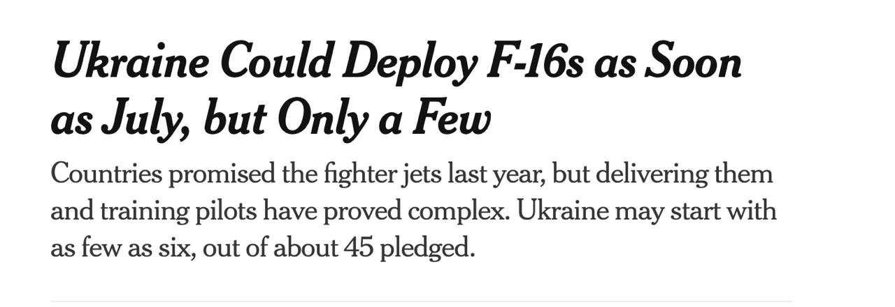При этом это не значит, что украинских пилотов не готовят. Ожидается, что на данный момент двенадцать пилотов - меньше, чем полная эскадрилья - будут готовы летать на F-16 в бою к лету этого года после 10 месяцев обучения в Дании, Великобритании и США.