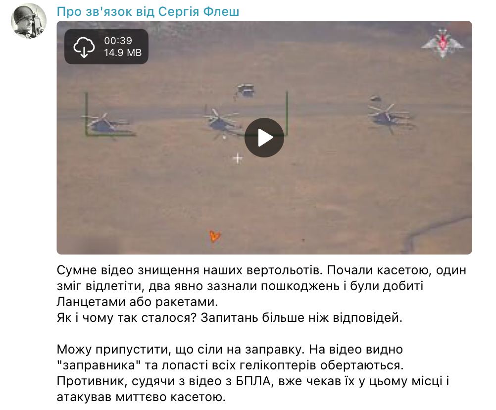 "Начали кассетой, один смог улететь, два явно получили повреждения и были добиты Ланцетами или ракетами. Могу предположить, что сели на заправку. На видео видно "заправщика" и лопасти всех вертолетов вращаются. Противник, судя по видео с БПЛА, уже ждал их в этом месте и атаковал мгновенно кассетой", - пишет он.