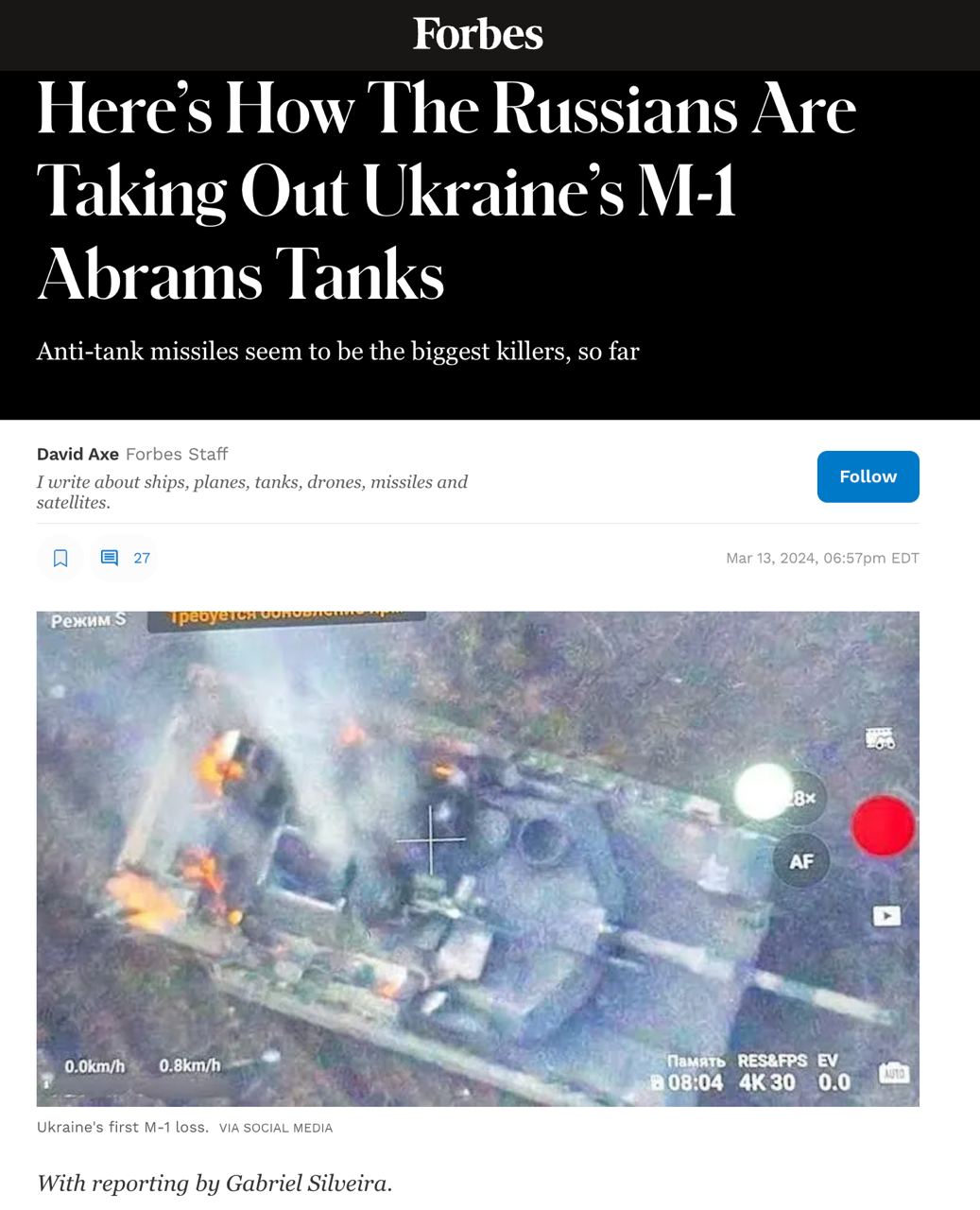 Американский журнал Forbes анализирует потерю первых трех американских танков Abrams в Украине и дает свою версию, как они были поражены.
