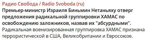 Премьер-министр Израиля Биньмин Нетаньяху отверг предложения ХАМАС по освобождению заложников, назвав их "абсурдными".