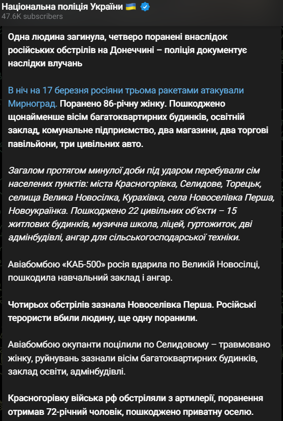 Всего за прошедшие сутки под ударом находились семь населенных пунктов Донецкой области: Красногоровка, Селидово, Торецк, Большая Новоселка, Кураховка, Новоселовка Первая, Новоукраинка.