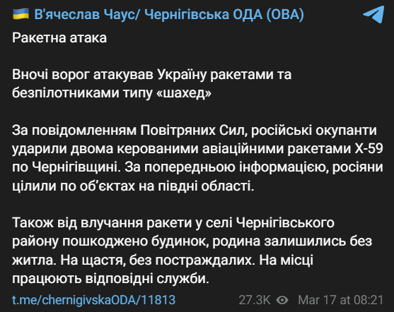 Армия РФ ударила двумя ракетами Х-59 по Черниговской области