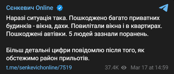 "Сейчас ситуация такова. Повреждены многие частные дома – окна, крыши. Вылетели окна и в квартирах. Повреждены автомобили. 5 человек получили ранения", - написал он.