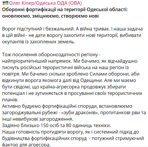 "Активно строим фортификационные сооружения, устанавливаем заградительные рубежи - "зубы дракона", противотанковые рвы и другие невзрывные заграждения", - написал глава ОВА.