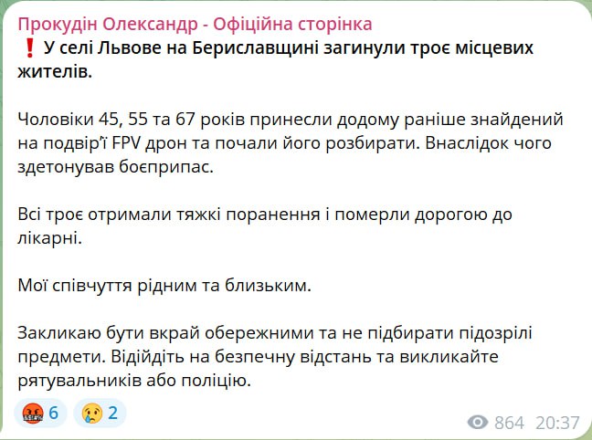 По его словам, мужчины 45, 55 и 67 лет принесли домой ранее найденный во дворе FPV дрон и начали его разбирать. В результате боеприпас сдетонировал.