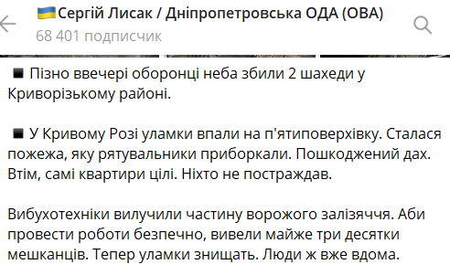 Об этом сообщил глава Днепропетровской областной военной администрации Сергей Лысак в своем телеграм-канале.