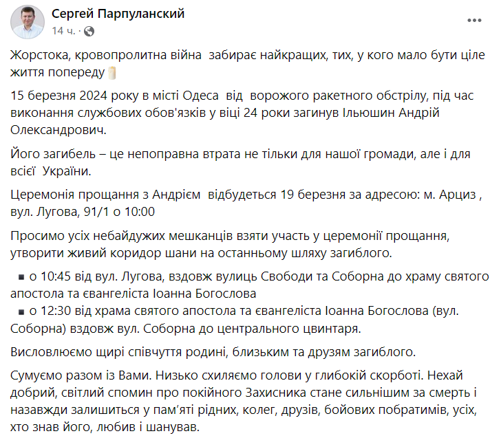 "15 марта 2024 года в городе Одесса от вражеских ракетных обстрелов во время исполнения служебных обязанностей в возрасте 24 года погиб Ильюшин Андрей Александрович", - говорится в сообщении.