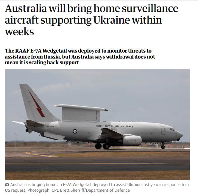СМИ пишет, что самолет E-7A Wedgetail Королевских ВВС Австралии, который осуществлял мониторинг угроз с момента своего развертывания в Германии в октябре, скоро завершит свою текущую миссию. Представитель Министерства обороны Австралии отметил, что Wedgetail помогал обеспечивать безопасность международных поставок в Украину ранним предупреждением в случае возможных действий или угроз со стороны России за пределами Украины, направленных против гуманитарной и военной помощи.