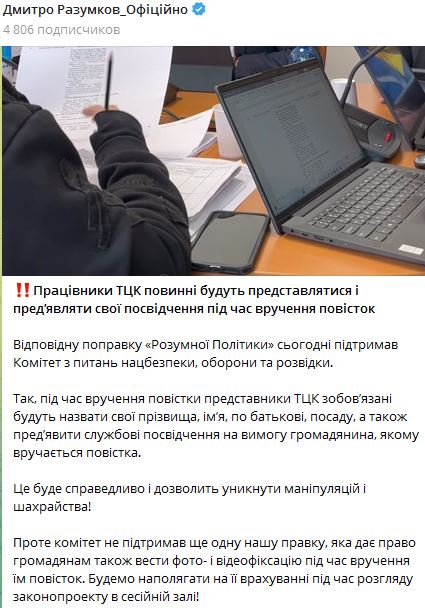 "Однако комитет не поддержал еще одну правку, которая дает право гражданам также вести фото- и видеофиксацию при вручении им повесток. Будем настаивать на ее учете при рассмотрении законопроекта в сессионном зале", – добавил Разумков.