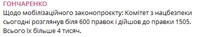 Тем временем нардеп Алексей Гончаренко сообщил, что оборонный комитет сегодня рассмотрел около 600 поправок и дошел до правки 1505. Всего их более 4 тысяч.