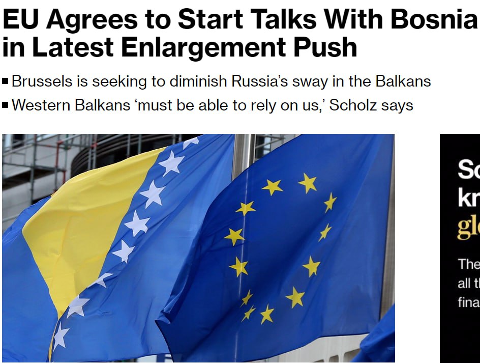 Лидеры Евросоюза согласились открыть переговоры о членстве в ЕС с Боснией и Герцеговиной, поскольку блок стремится втянуть разделенную западно-балканскую страну в свою орбиту, чтобы противостоять растущему влиянию России.
