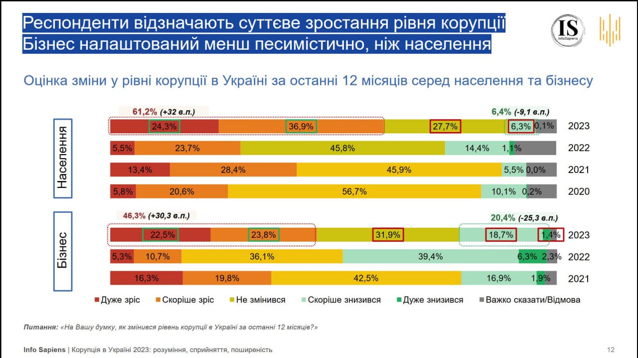 Согласно результатам опроса, рост уровня коррупции в 2023 году отмечают 61,2% населения, что более чем в два раза больше, чем в 2022-м, и 46,3% представителей бизнеса, что почти втрое превышает показатель 2022 года.