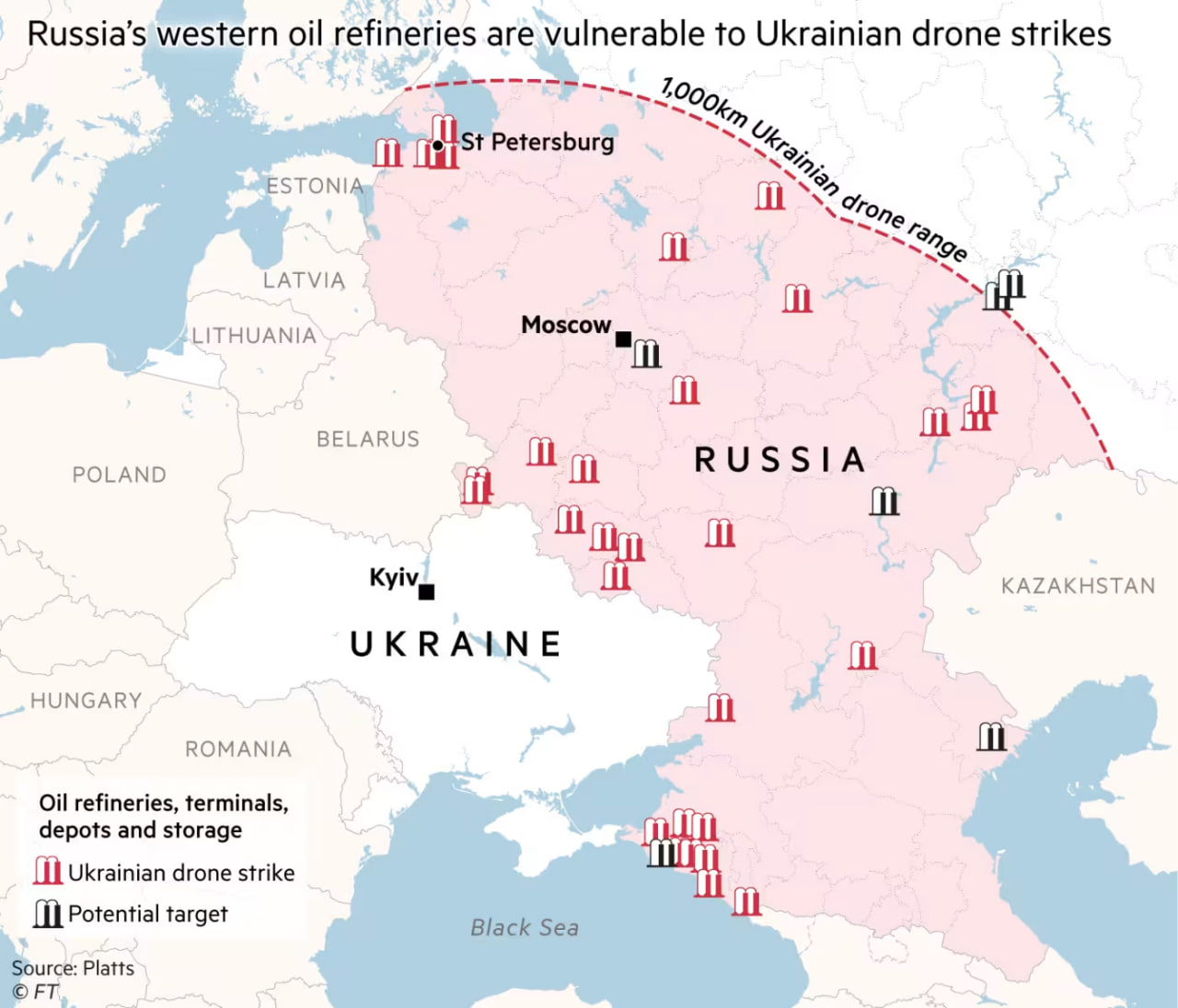 Издание напоминает, что с 2022 года произошло как минимум 12 нападений на крупные российские нефтеперерабатывающие заводы и как минимум девять в этом году, а также на несколько терминалов, складов и хранилищ.
