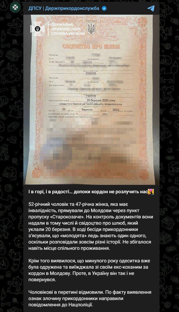 Кроме того, оказалось, что в прошлом году одесситка уже была замужем и уезжала со своим экс-любимым за границу в Молдову. Однако в Украину он так и не вернулся", - сообщают в ГПСУ.
