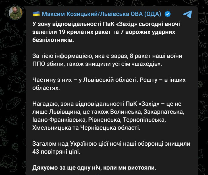 08:28 Ночью россияне запустили по Украине 29 крылатых ракет Х-101/Х-555. Сбито из них было 18, сообщил командующий Воздушных сил Олещук.