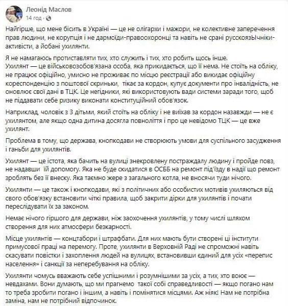 "Уклонист – это военнообязанное лицо, которое притворяется, что его нет. Не стоит на учете, не работает официально, умышленно не проживает по месту регистрации или выбрасывает официальную корреспонденцию из почтового ящика, убегает за границу, покупает документы об инвалидности, не обновляет свои данные в ТЦК", – написал Маслов.