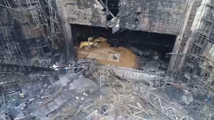 Огонь уничтожил всю внутреннюю отделку, включая посадочные места для зрителей и панели вокруг сцены. Былое обустройство "Крокуса" угадывается лишь по следам концентрических полуокружностей на месте зрительного зала, белеющим бетонным лестницам и по расчищенному техникой участку, где располагалась сцена для артистов.