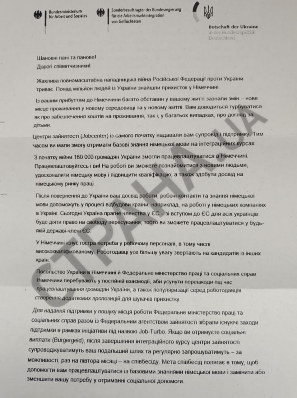 Такое письмо начало приходить домой к гражданам Украины, живущим в Германии. Помимо Макеева, его подписали немецкий министр труда Хубертус Хайль и уполномоченный по интеграции беженцев Даниэль Терценбах.